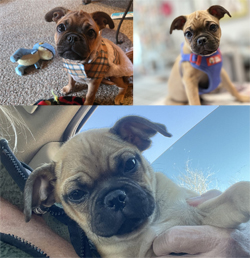 This 3-month-old Bugg (Boston Terrier/Pug mix) came all the way from Texas and immediately claimed his throne as king of zoomies, snuggles, and toy chaos. From the second he landed, he’s been bouncing, wrestling with his dog buddy, and investigating every corner like a tiny furry detective.